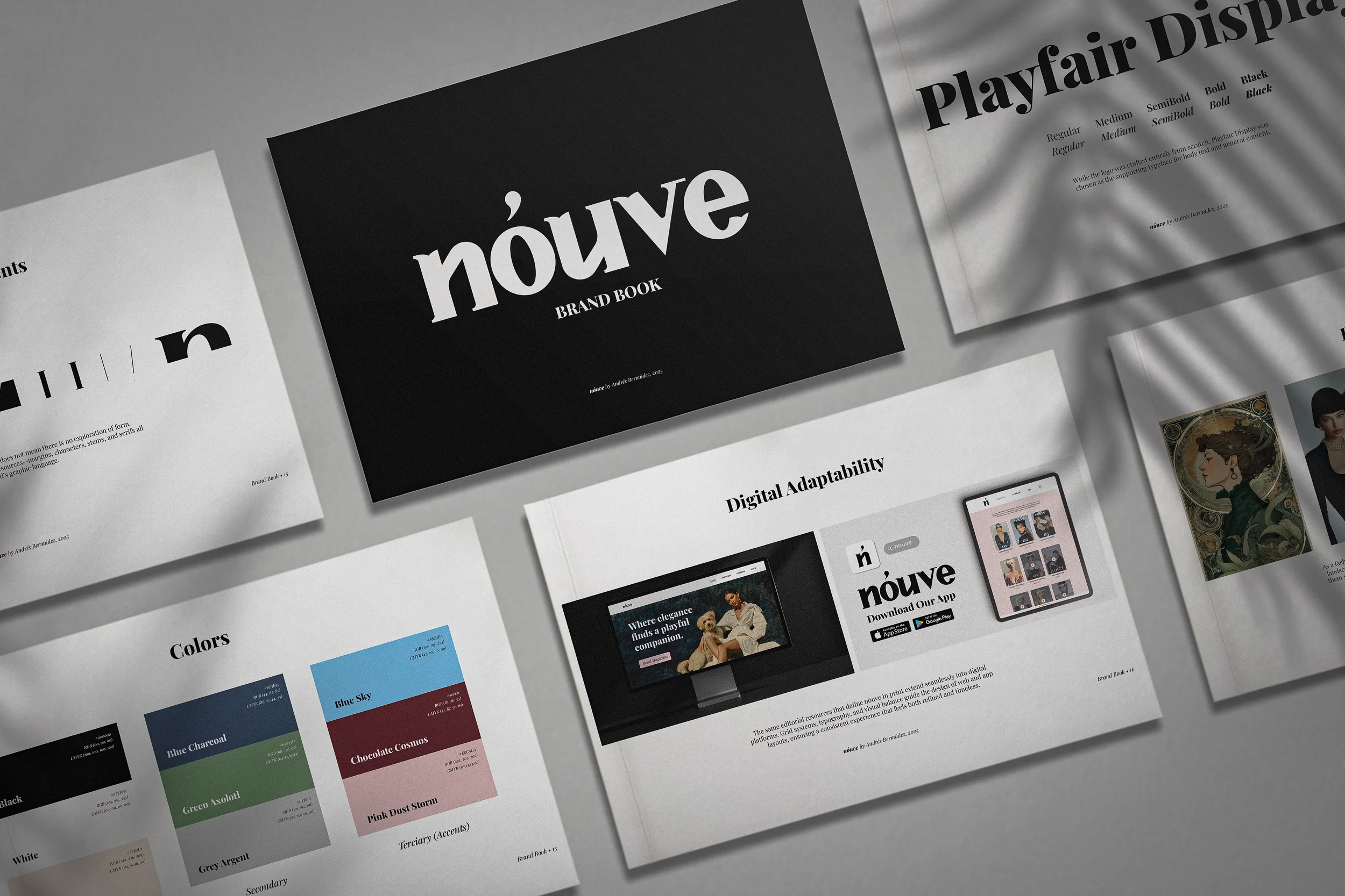 A distilled guide to nóuve identity—typography, color, and structure crafted to keep the brand consistent across every platform, from print to digital.